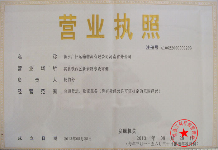 衡水广怀运输物流有限公司河南省分公司营业执照(正本)
